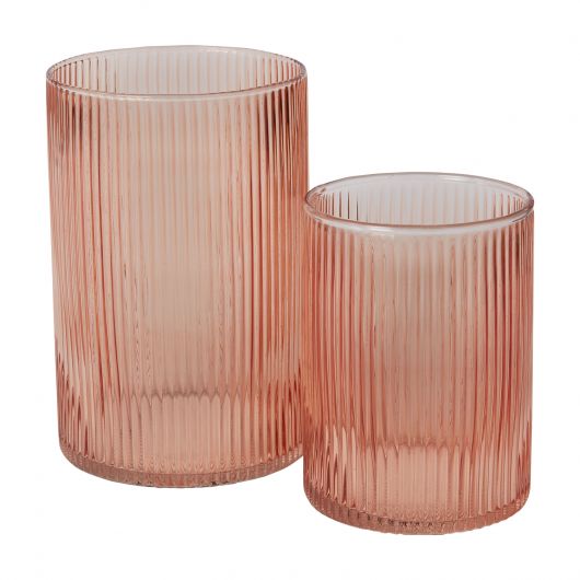 The simple ribbed cylindrical shape of the the Bellini Vase has a romantic vibe provided by the peachy rose tint of the glass.
